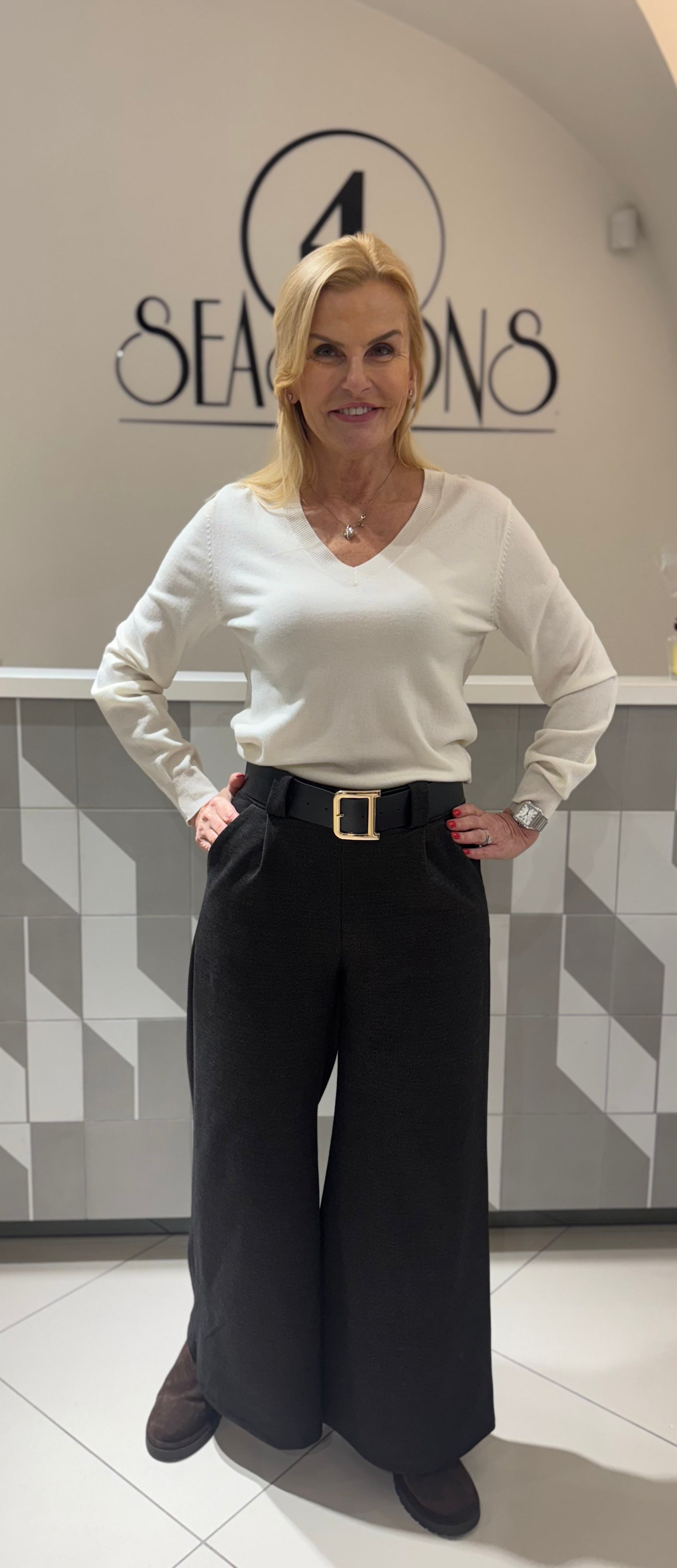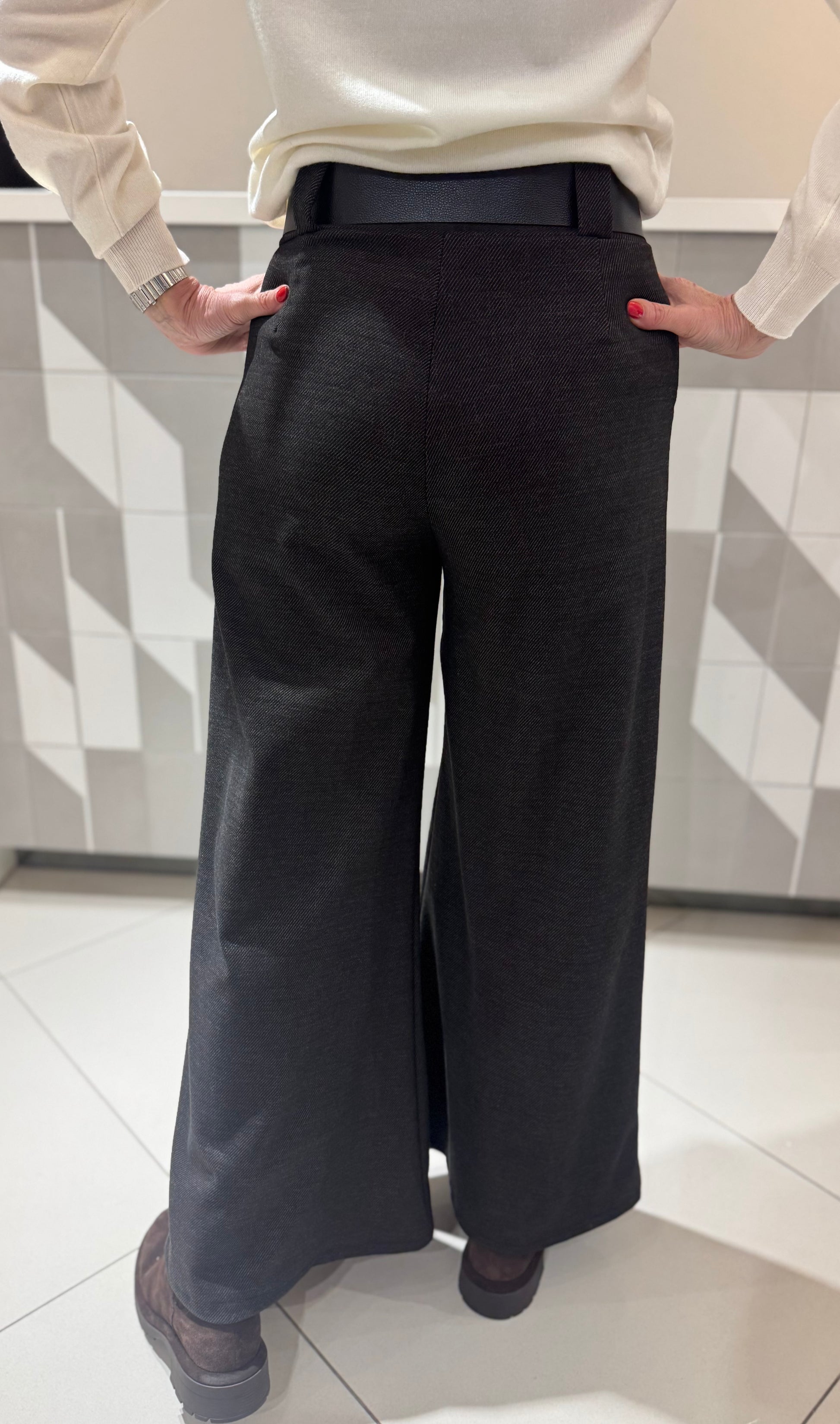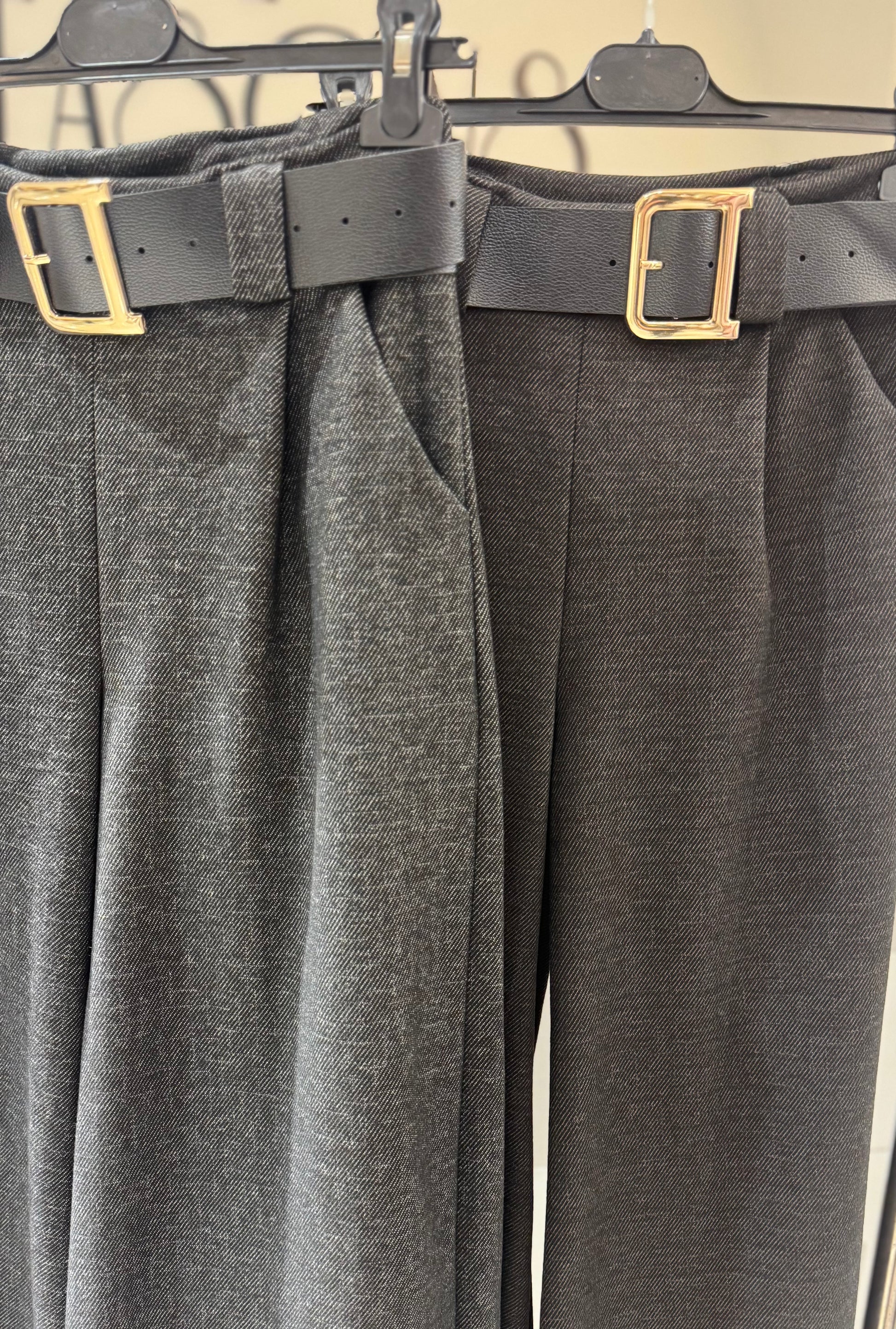 Elegantiškos storesnio audinio plačios kelnės su aukštu liemeniu ir diržu. Patogus kirpimas, dailiai formuojantis siluetą, puikiai tinkantis tiek kasdieniam, tiek klasikiniam įvaizdžiui.