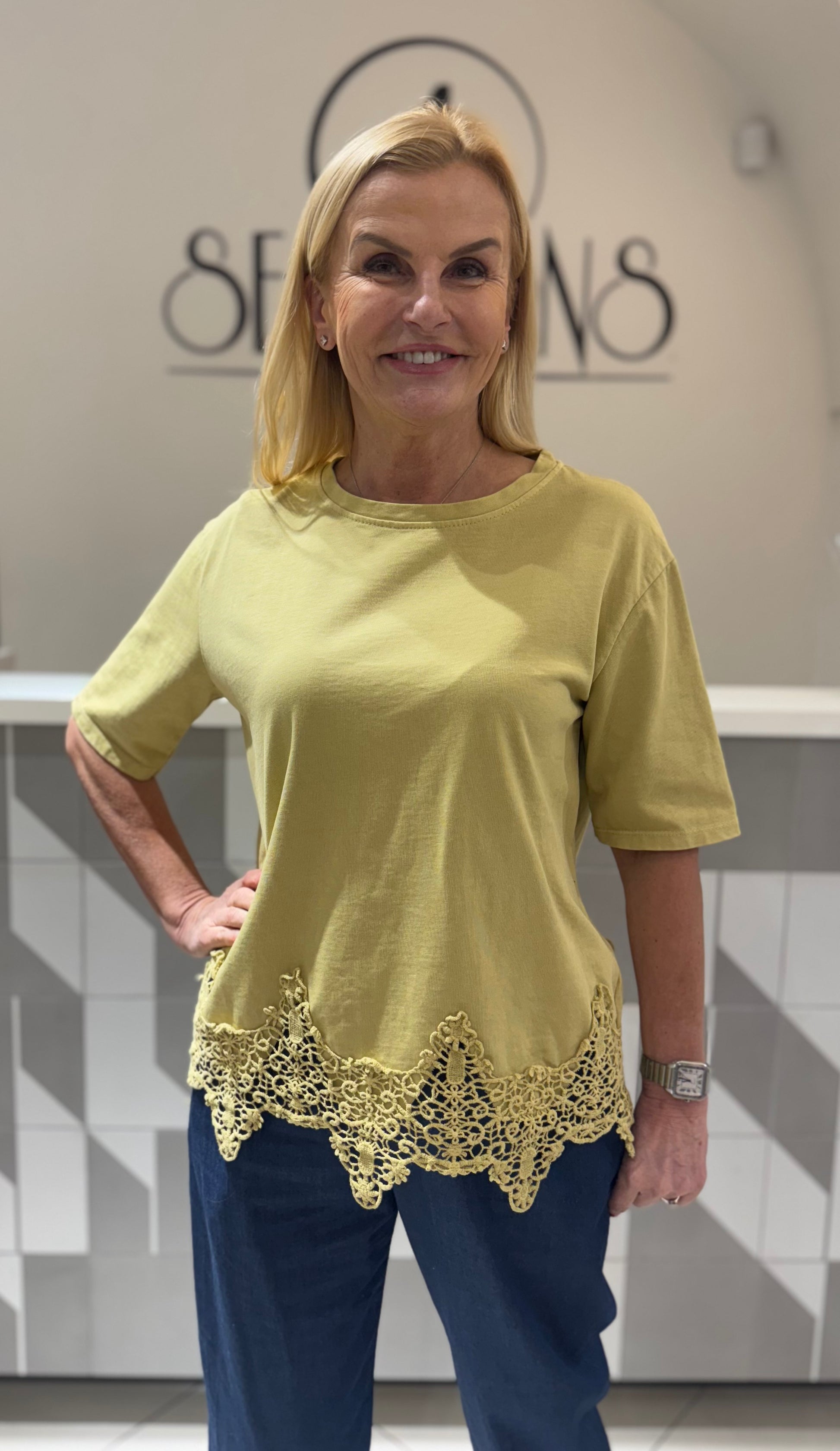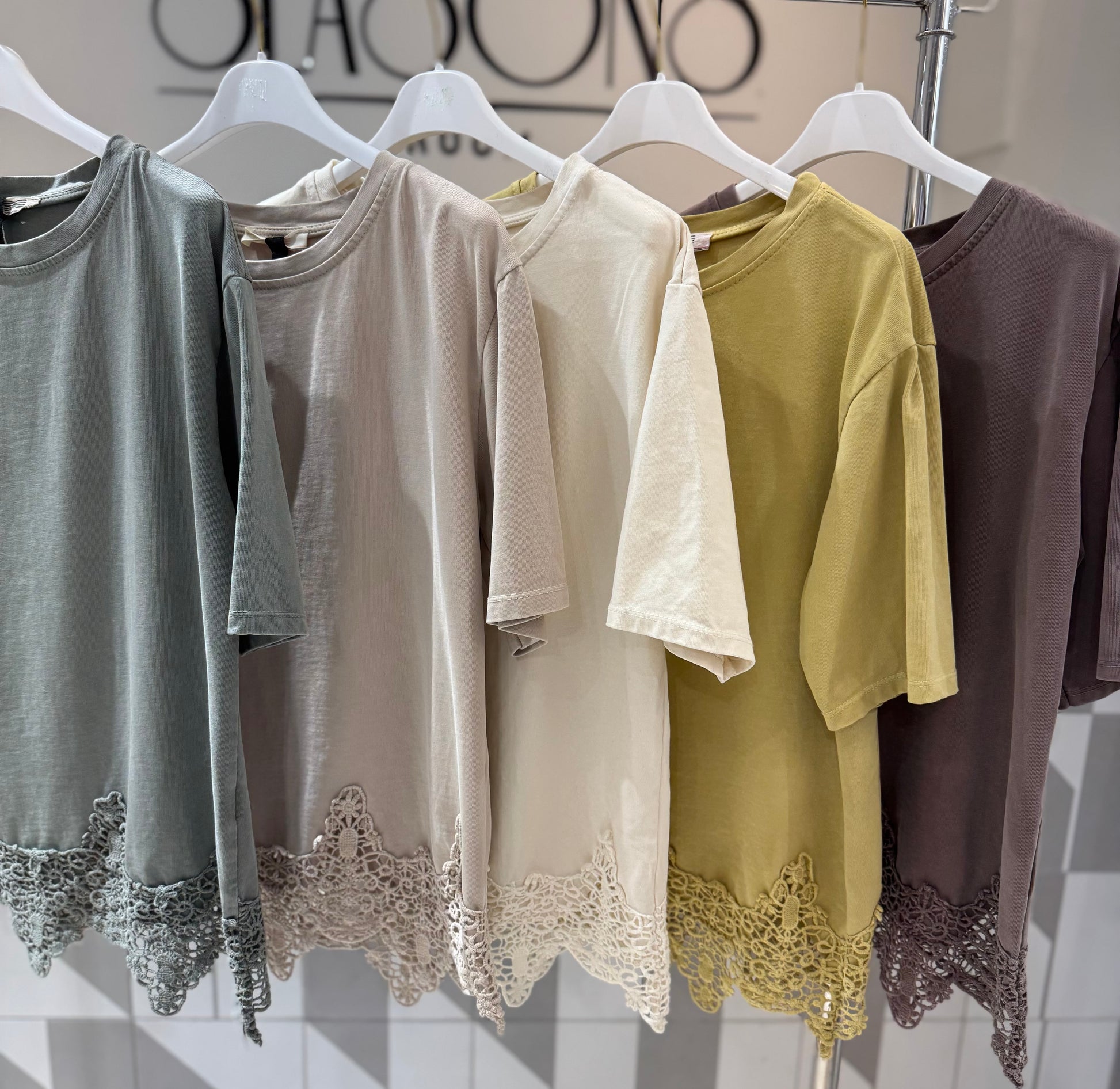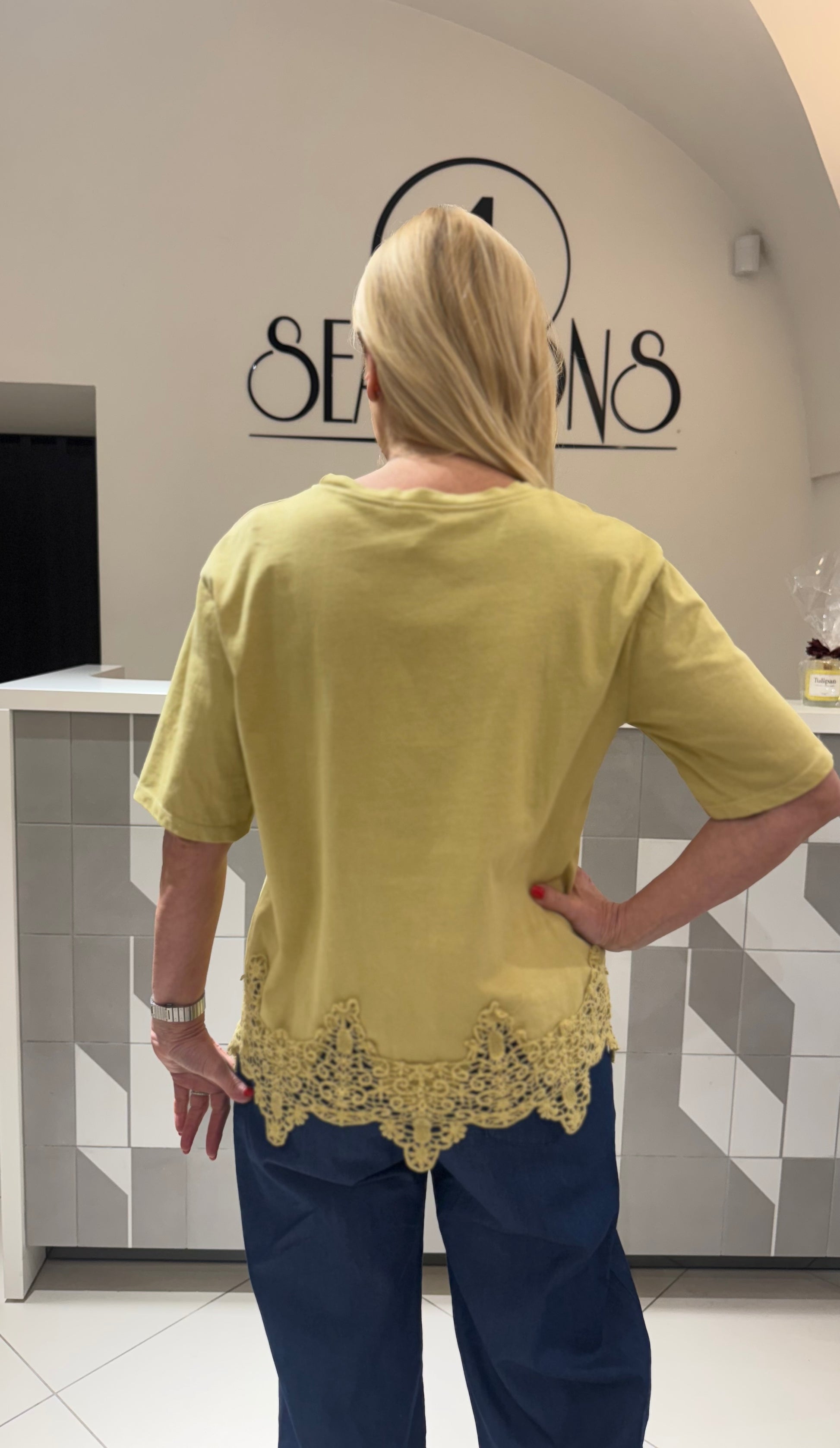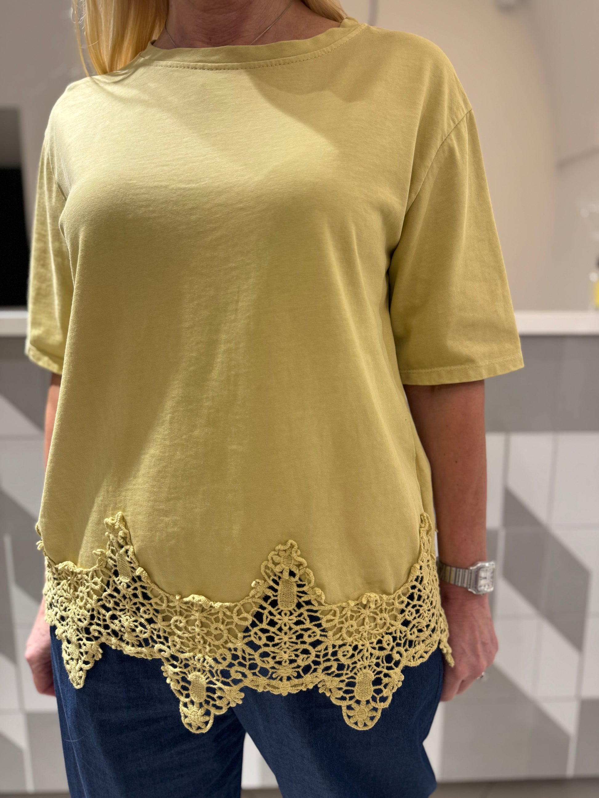 Palaidinė trumpomis rankovėmis su dekoratyviniu nėrinių apvadu apačioje. Lengva, patogi ir stilinga – puikiai tinka kasdieniam dėvėjimui bei laisvalaikiui. Lengvai derinama su džinsais ar kelnėmis.